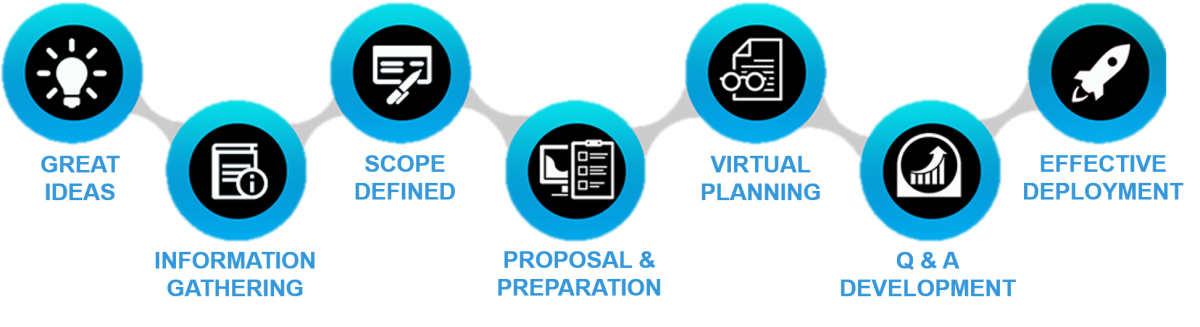 While we work “virtually” from our home office, we set up a system for regular communication to ensure that you are well connected and always informed. To start and work with a new client, we follow an 8-step Virtual System that allow you to save time and money.